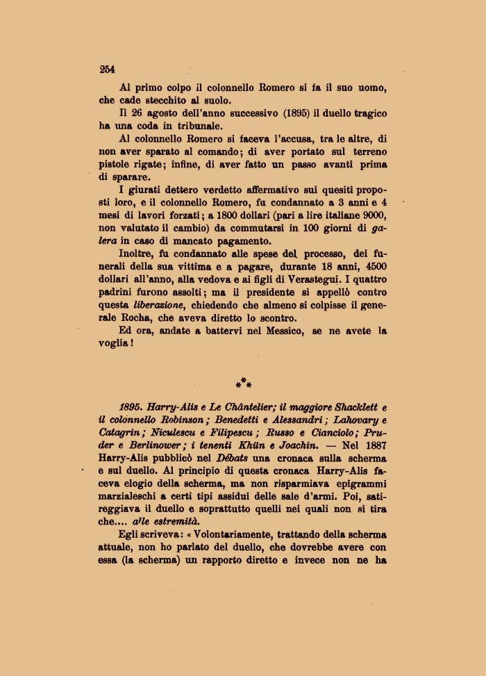 1895. Harry-Alis e Le Chàntelier; il maggiore Shacklett e il colonnello Robinson ; Benedetti e Alessandri ; Lahovary e Catagrin ; Niculescu e Filipescu ; Russo e Cianciolo ; Pruder e Berlinower ; i tenenti Khiln e Joachin. — Nel 1887 Harry-Alis pubblicò nel Débats una cronaca sulla scherma e sul duello. Al principio di questa cronaca Harry-Alis faceva elogio della scherma, ma non risparmiava epigrammi marzialeschi a certi tipi assidui delle sale d'armi. Poi, satireggiava il duello e soprattutto quelli nei quali non si tira che.... aHe estremità.