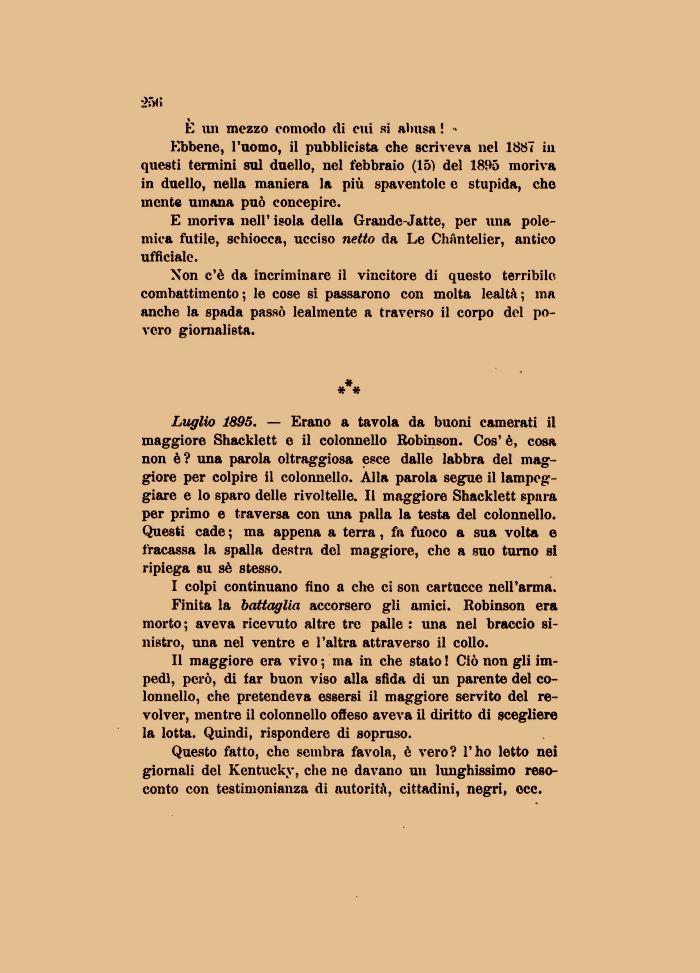 Ebbene, l'uomo, il pubblicista che scriveva nel 1887 in questi termini sul duello, nel febbraio (15) del 1895 moriva in duello, nella maniera la più spaventolc e stupida, che mente umana può concepire.