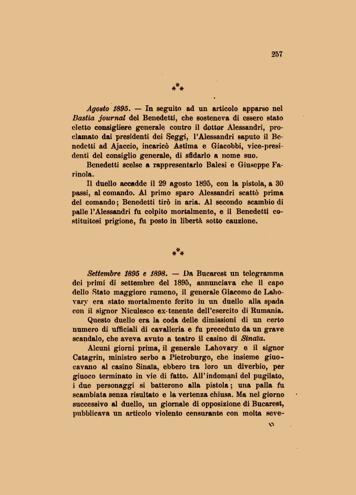 Settembre 1895 e 1898. — Da Bucarest un telegramma dei primi di settembre del 1895, annunciava che il capo dello Stato maggiore rumeno, il generale Giacomo de Laho-vary era stato mortalmente ferito in un duello alla spada con il signor Niculesco ex-tenente dell'esercito di Rumania.