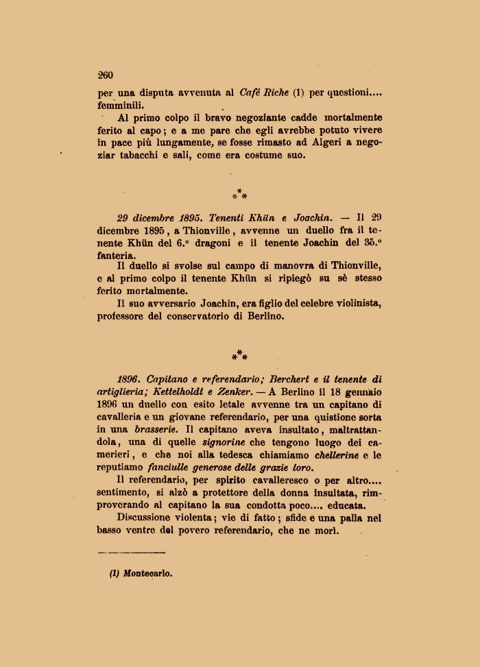1896. Capitano e referendario ; Berchert e il tenente di artiglieria; Kettelholdt e Zenker.— A Berlino il 18 geimaio 1896 un duello con esito letale avvenne tra un capitano di cavalleria e un giovane referendario, per una quistione sorta in una brasserie. Il capitano aveva insultato, maltrattandola, una di quelle signorine che tengono luogo dei camerieri , e che noi alla tedesca chiamiamo chellerine e le reputiamo fanciulle generose delle grazie loro.