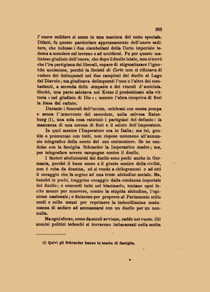In quel mentre l'Imperatore era in Italia; ma lui, gentile e premuroso con tutti, non rispose nemmeno all'annunzio telegrafico della morte del suo cerimoniere. Se ne condolse con la famiglia Schraeder la Imperatrice madre ; ma, per telegrafare severe rampogne contro il duello.