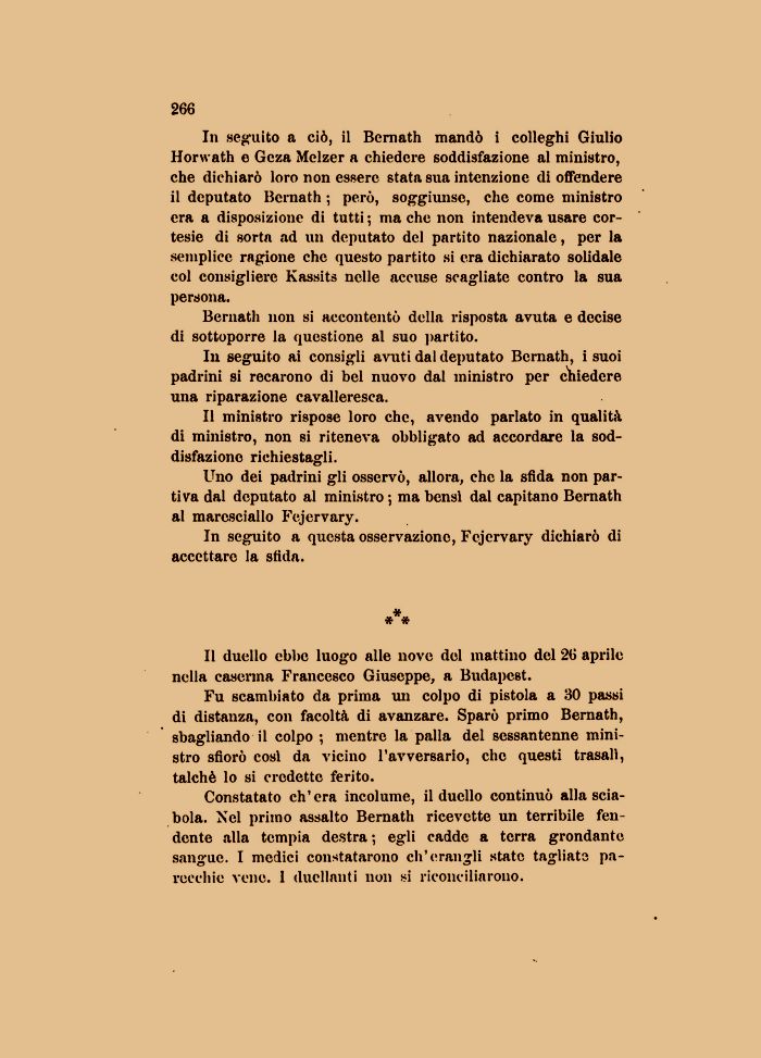 Uno dei padrini gli osservò, allora, che la sfida non partiva dal deputato al ministro ; ma bensì dal capitano Bernath al maresciallo Fejervary.