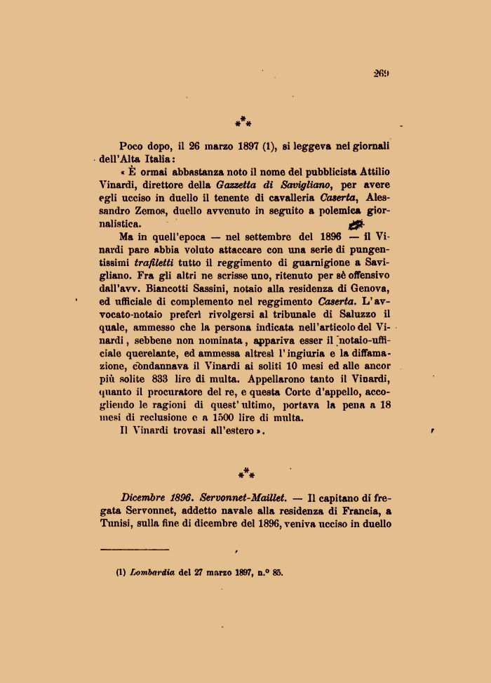 « È ormai abbastanza noto il nome del pubblicista Attilio Vinardi, direttore della Gazzetta di Savigliano, per avere egli ucciso in duello il tenente di cavalleria Caserta, Alessandro Zemos, duello avvenuto in seguito a polemica giornalistica. j^JS!¦