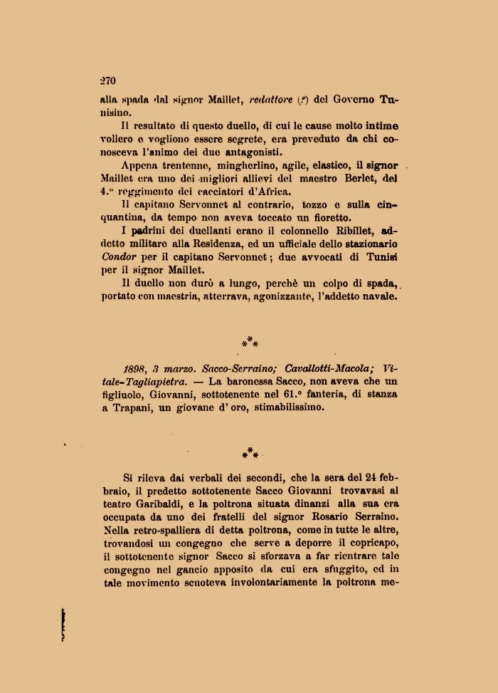 1898, 3 marzo. Sacco-Serraino; Cavallotti-Macola; Vitale- Tagliapietra. — La baronessa Sacco, non aveva che un figliuolo, Giovanni, sottotenente nel 61.° fanteria, di stanza a Trapani, un giovane d' oro, stimabilissimo.
