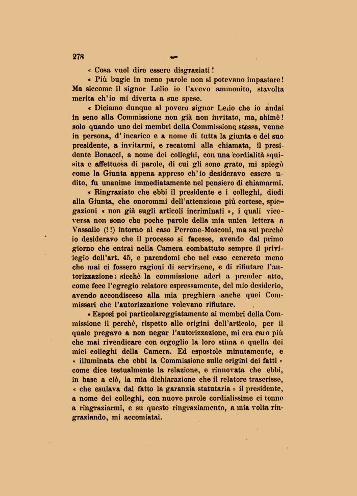 « Esposi poi particolareggiatamente ai membri della Commissione il perchè, rispetto alle origini dell'articolo, per il quale pregavo a non negar l'autorizzazione, mi era caro più che mai rivendicare con orgoglio la loro stima e quella dei miei colleghi della Camera. Ed espostole minutamente, e « illuminata che ebbi la Commissione sulle origini dei fatti » come dice testualmente la relazione, e rinnovata che ebbi, in base a ciò, la mia dichiarazione che il relatore trascrisse, « che esulava dal fatto la garanzia statutaria » il presidente, a nome dei colleghi, con nuove parole cordialissime ci tenne a ringraziarmi, e su questo ringraziamento, a mia volta ringraziando, mi accomiatai.