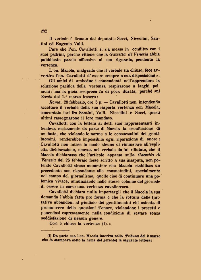Cavallotti con la lettera ai detti suoi rappresentanti intendeva recisamente da parte di Macola la sconfessione di un fatto, che violando le norme e le consuetudini dei gentiluomini, renderebbe impossibile ogni riparazione di onore ; Cavallotti non intese in modo alcuno di rinunziare all'esplicita dichiarazione, omessa nel verbale da lui rifiutato, che il Macola dichiarasse che l'articolo apparso sulla Gazzetta di Venezia del 25 febbraio fosse scritto a sua insaputa, non potendo Cavallotti stesso ammettere che Macola stabilisca un precedente non rispondente alle consuetudini, specialmente nel campo del giornalismo, quello cioè di continuare una polemica vivace, annunziando nelle stesse colonne del giornale di essere in corso ima vertenza cavalleresca.