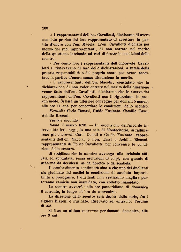 Jtoma, 5 marzo 1898. — In esecuzione dell'accordo intervenuto ieri, oggi, in una sala di Montecitorio, si radunarono gli onorevoli Carlo Donati e Guido Fusinato, rappresentanti dell'on. Macola, e l'on. Tassi e Achille Bizzoni, rappresentanti di Felice Cavallotti, per convenire le condizioni dello scontro.