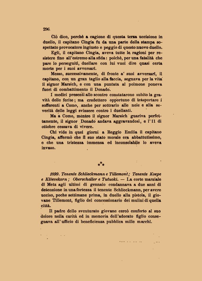 1899. Tenente Schlieckmann e Tillemont; Tenente Koepe e Kloevekorn ; Oberschaller e Tutuoki. — La corte marziale di Metz agli ultimi di gennaio condannava a due anni di detenzione in una fortezza il tenente Schlieckmann, per avere ucciso, poche settimane prima, in duello alla pistola, il giovane Tillemont, figlio del concessionario dei mulini di quella città.