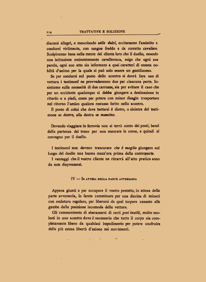 discorsi allegri, e mescolando utile dulci, ecciteranno l'assistito a condursi virilmente, con sangue freddo e da corretto cavaliere. Scolpiranno bene nella mente del cliente loro che il duello, essendo una istituzione eminentemente cavalleresca, esige che ogni sua parola, ogni suo atto sia informato a quei caratteri di onesta nobiltà d'animo per la quale si può solo essere un gentiluomo.
