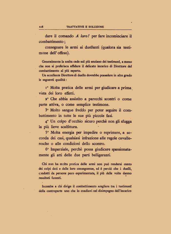 Chi non ha molta pratica delle armi non può rendersi conto dei colpi dati e delle loro conseguenze, ed è perciò che i duelli, condotti da persone poco esperimentate, il più delle volte danno resultati funesti.