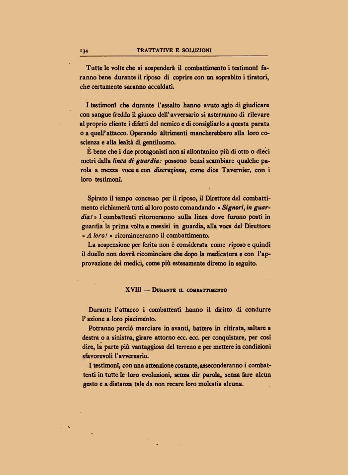 I testimoni che durante l'assalto hanno avuto agio di giudicare con sangue freddo il giuoco dell' avversario si asterranno di rilevare al proprio cliente i difetti del nemico e di consigliarlo a questa parata o a quell'attacco. Operando altrimenti mancherebbero alla loro coscienza e alla lealtà di gentiluomo.