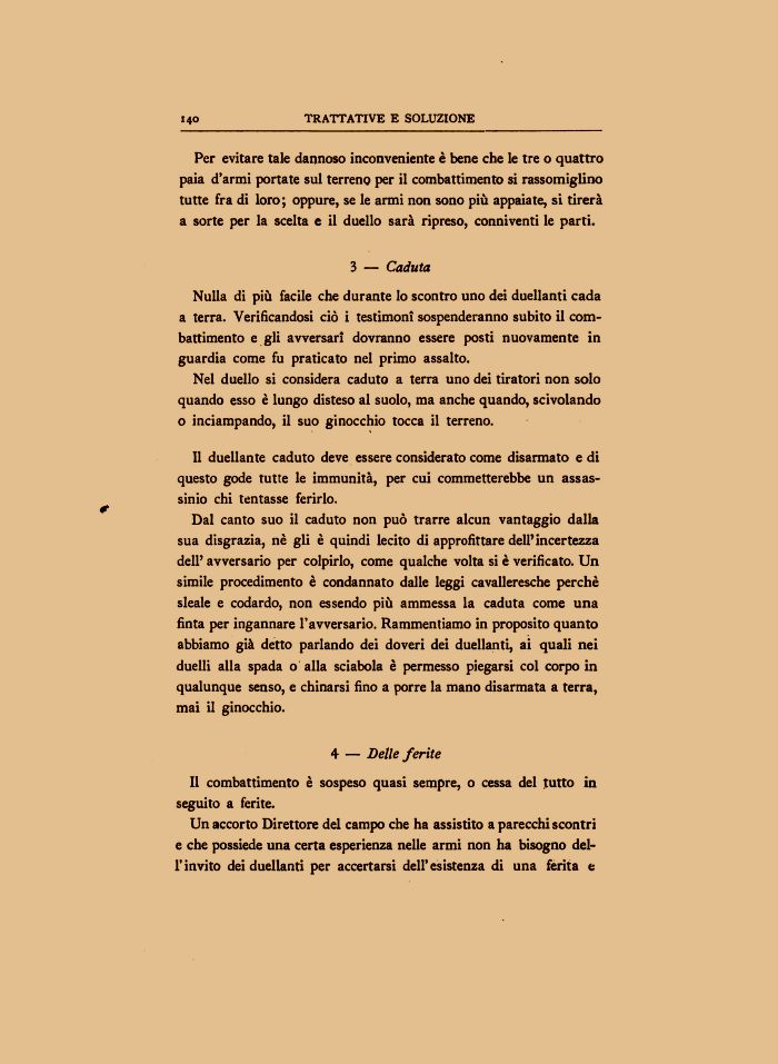 Dal canto suo il caduto non può trarre alcun vantaggio dalla sua disgrazia, nè gli è quindi lecito di approfittare dell'incertezza dell' avversario per colpirlo, come qualche volta si è verificato. Un simile procedimento è condannato dalle leggi cavalleresche perchè sleale e codardo, non essendo più ammessa la caduta come una finta per ingannare l'avversario. Rammentiamo in proposito quanto abbiamo già detto parlando dei doveri dei duellanti, ai quali nei duelli alla spada o alla sciabola è permesso piegarsi col corpo in qualunque senso, e chinarsi fino a porre la mano disarmata a terra, mai il ginocchio.