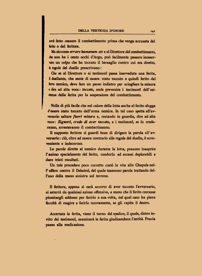 Che se al Direttore o ai testimoni passa inavveduta una ferita, il duellante, che sente di essere stato toccato e quindi ferito dal ferro nemico, deve fare un passo indietro per sciogliere la misura e dire ad alta voce : toccato, onde prevenire i testimoni dell' esistenza della ferita per la sospensione del combattimento.