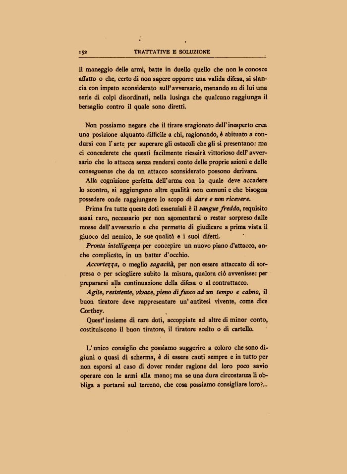 Alla cognizione perfetta dell'arma con la quale deve accadere lo scontro, si aggiungano altre qualità non comuni e che bisogna possedere onde raggiungere lo scopo di dare e non ricevere.