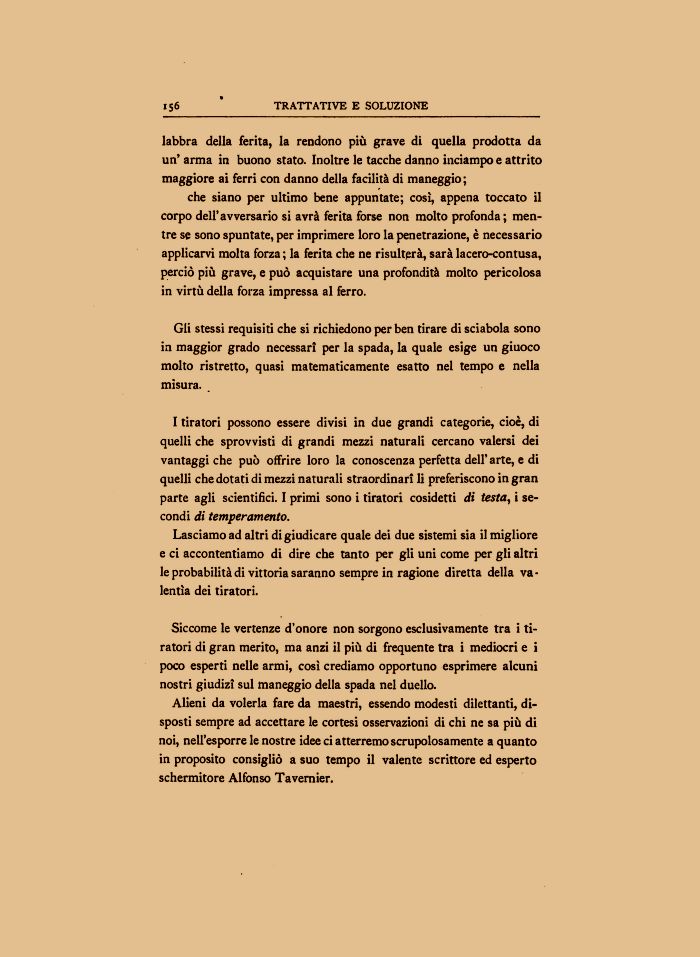 I tiratori possono essere divisi in due grandi categorie, cioè, di quelli che sprovvisti di grandi mezzi naturali cercano valersi dei vantaggi che può offrire loro la conoscenza perfetta dell'arte, e di quelli che dotati di mezzi naturali straordinari li preferiscono in gran parte agli scientifici. I primi sono i tiratori cosidetti di testa, i secondi di temperamento.