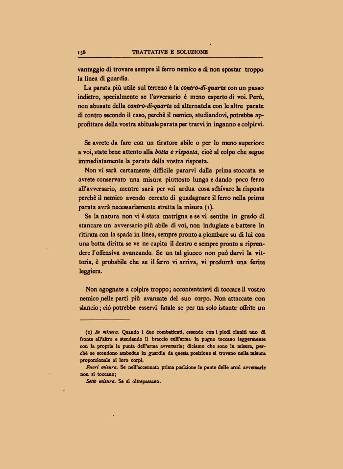 Non vi sarà certamente difficile pararvi dalla prima stoccata se avrete conservato una misura piuttosto lunga e dando poco ferro all'avversario, mentre sarà per voi ardua cosa sdhìvare la risposta perchè il nemico avendo cercato di guadagnare il ferro nella prima parata avrà necessariamente stretta la misura (i).