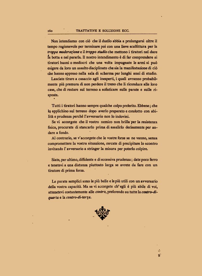 Non intendiamo con ciò che il duello abbia a prolungarsi oltre il tempo ragionevole per terminare poi con una lieve scalfittura per la troppa moderazione e il troppo studio che mettono i tiratori nel dare fa botta e nel pararla. II nostro intendimento è di far comprendere ai tiratori buoni o mediocri che una volta impugnate le armi si può esigere da loro un assalto disciplinato che sia la manifestazione di ciò che hanno appreso nella sala di scherma per lunghi anni di studio.