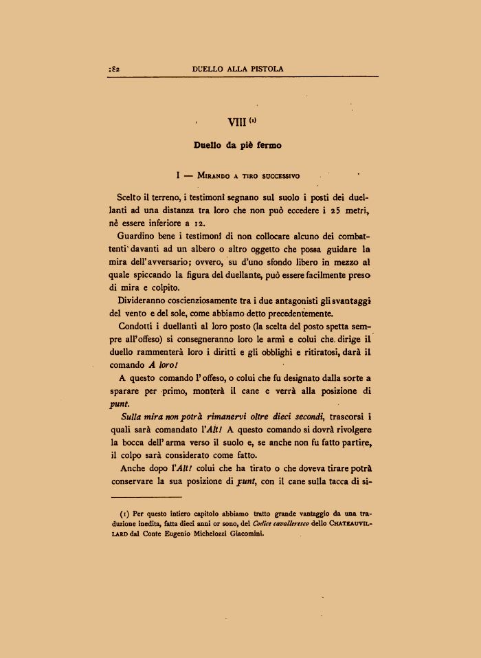 Condotti i duellanti al loro posto (la scelta del posto spetta sempre all'offeso) si consegneranno loro le armi e colui che. dirige il duello rammenterà loro i diritti e gli obblighi e ritiratosi, darà il comando A loro/