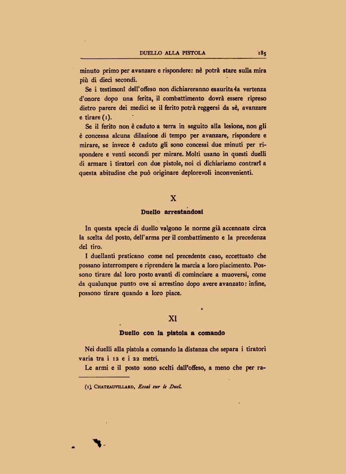 Se il ferito non è caduto a terra in seguito alla lesione, non gli è concessa alcuna dilazione di tempo per avanzare, rispondere e mirare, se invece è caduto gli sono concessi due minuti per rispondere e venti secondi per mirare. Molti usano in questi duelli di armare i tiratori con due pistole, noi ci dichiariamo contrari a questa abitudine che può originare deplorevoli inconvenienti.