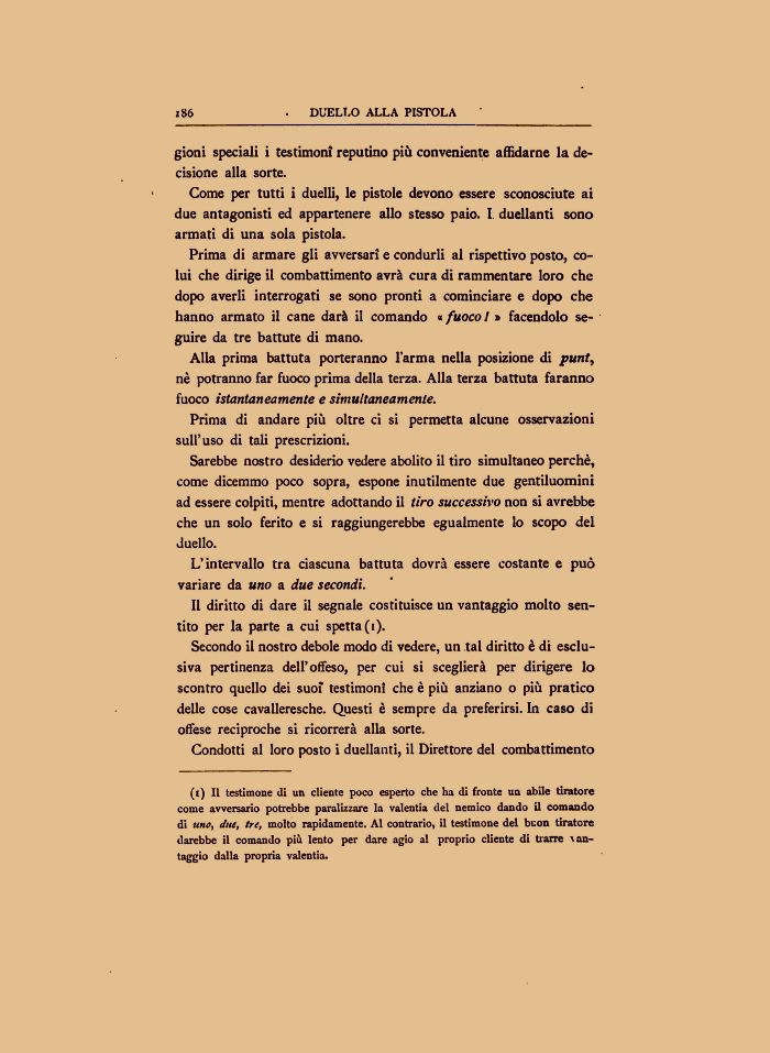Sarebbe nostro desiderio vedere abolito il tiro simultaneo perchè, come dicemmo poco sopra, espone inutilmente due gentiluomini ad essere colpiti, mentre adottando il tiro successivo non si avrebbe che un solo ferito e si raggiungerebbe egualmente lo scopo del duello.