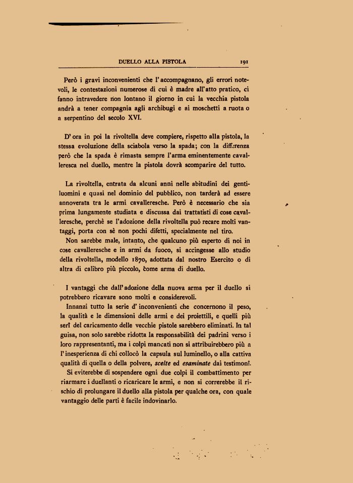 D' ora in poi la rivoltella deve compiere, rispetto alla pistola, la stessa evoluzione della sciabola verso la spada; con la differenza però che la spada è rimasta sempre l'arma eminentemente cavalleresca nel duello, mentre la pistola dovrà scomparire del tutto.