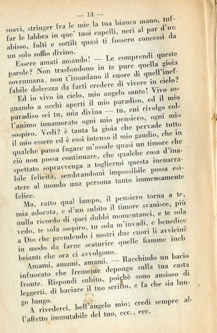 Ed io vivo in cielo, mio angelo santo! Vivo sognando a occhi aperti il mio paradiso, ed il mio paradiso sei tu, mia divina —- tu, cui rivolgo col-l'animo innamorato ogni mio pensiero, ogni mio sospiro. Vedi? è tanta la gioia che pervade tutto il mio essere ed è così intenso il mio gaudio, che in qualche pausa fugace m'assale quasi un timore che ciò non possa continuare, che qualche cosa d'inaspettato sopravvenga a togliermi questa inenarra bile felicità, sembrandomi impossibile possa esistere a! inondo una persona tanto immensamente felice.