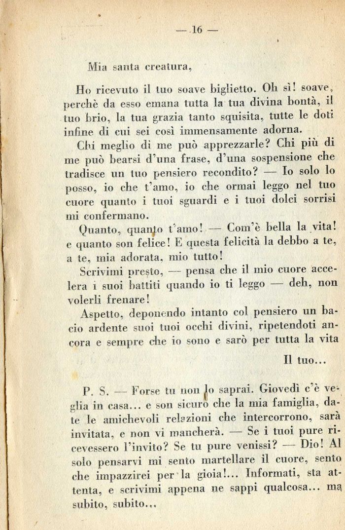 P. S. — Forse tu non Io saprai. Giovedì c'è veglia in casa... e son sicuro che la mia famiglia, date le amichevoli relazioni che intercorrono, sarà invitata, e non vi mancherà. — Se i tuoi pure ricevessero l'invito? Se tu pure venissi? — Dio! Al solo pensarvi mi sento martellare il cuore, sento che impazzirei per la gioia!... Informati, sta attenta, e scrivimi appena ne sappi qualcosa... ma subito, subito.,.