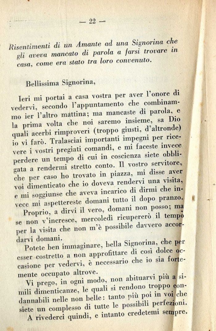 Ieri mi portai a casa vostra per aver l'onore di vedervi, secondo l'appuntamento che combinammo ier l'altro mattina; ma mancaste di parola, e la prima volta che noi saremo insieme, sa Dio quali acerbi rimproveri (troppo giusti, d'altronde) io vi farò. Tralasciai importanti impegni per ricevere i vostri pregiati comandi, e mi faceste invece perdere un tempo di cui in coscienza siete obbligata a rendermi stretto conto. Il vostro servitore, che per caso ho trovato in piazza, mi disse aver voi dimenticato che io doveva rendervi una visita, e mi soggiunse che aveva incarico di dirmi che invece mi aspettereste domani tutto il dopo pranzo.