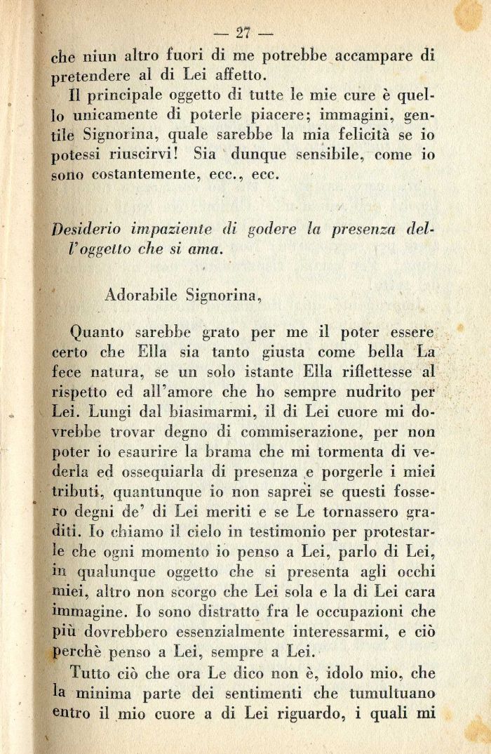 Il principale oggetto di tutte le mie cure è quello unicamente di poterle piacere; immagini, gentile Signorina, quale sarebbe la mia felicità se io potessi riuscirvi! Sia dunque sensibile, come io sono costantemente, ecc., ecc.
