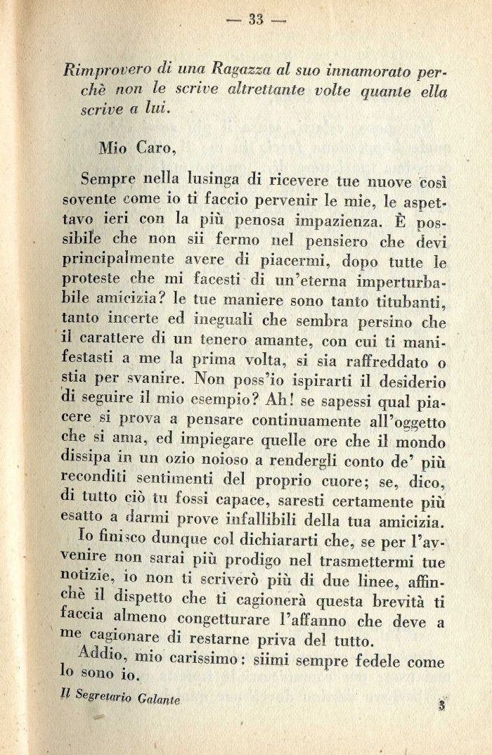 Sempre nella lusinga di ricevere tue nuove così sovente come io ti faccio pervenir le mie, le aspettavo ieri con la più penosa impazienza. È possibile che non sii fermo nel pensiero che devi principalmente avere di piacermi, dopo tutte le proteste che mi facesti di un'eterna imperturbabile amicizia? le tue maniere sono tanto titubanti, tanto incerte ed ineguali che sembra persino che il carattere di un tenero amante, con cui ti manifestasti a me la prima volta, si sia raffreddato o stia per svanire. Non poss'io ispirarti il desiderio di seguire il mio esempio? Ah! se sapessi qual piacere si prova a pensare continuamente all'oggetto che si ama, ed impiegare quelle ore che il mondo dissipa in un ozio noioso a rendergli conto de' più reconditi sentimenti del proprio cuore; se, dico, di tutto ciò tu fossi capace, saresti certamente più esatto a darmi prove infallibili della tua amicizia.