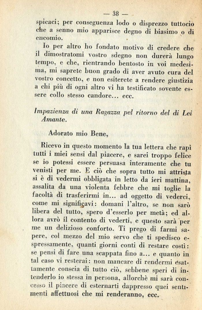 Ricevo in questo momento la tua lettera che rapì tutti i miei sensi dal piacere, e sarei troppo felice se io potessi essere persuasa interamente che tu venisti per me. E ciò che sopra tutto mi attrista si è di vedermi obbligata in letto da ieri mattina, assalita da una violenta febbre che mi toglie la facoltà di trasferirmi in... ad oggetto di vederci, come mi significavi : domani l'altro, se non sarò libera del tutto, spero d'esserlo per metà; ed allora avrò il contento di vederti, e questo sarà per me un delizioso conforto. Ti prego di farmi sapere, col mezzo del mio servo che ti spedisco e-spressamente, quanti giorni conti di restare costì : se pensi di fare una scappata fino a... e quanto in tal caso vi resterai : non mancare di rendermi Esattamente conscia di tutto ciò, sebbene speri di intenderlo io stessa in persona, allorché mi sarà concesso il piacere di esternarti dappresso quei sentimenti affettuosi che mi renderanno, ecc.