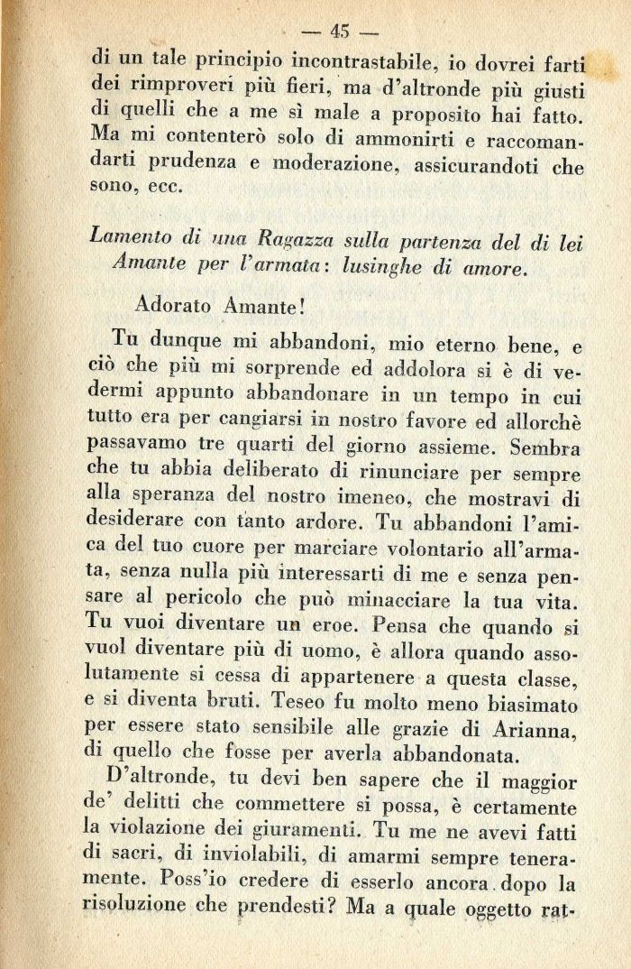 Tu dunque mi abbandoni, mio eterno bene, e ciò che più mi sorprende ed addolora si è di vedermi appunto abbandonare in un tempo in cui tutto era per cangiarsi in nostro favore ed allorché passavamo tre quarti del giorno assieme. Sembra che tu abbia deliberato di rinunciare per sempre alla speranza del nostro imeneo, che mostravi di desiderare con tanto ardore. Tu abbandoni l'amica del tuo cuore per marciare volontario all'armata, senza nulla più interessarti di me e senza pensare al pericolo che può minacciare la tua vita. Tu vuoi diventare un eroe. Pensa che quando si vuol diventare più di uomo, è allora quando assolutamente si cessa di appartenere a questa classe, e si diventa bruti. Teseo fu molto meno biasimato per essere stato sensibile alle grazie di Arianna, di quello che fosse per averla abbandonata.