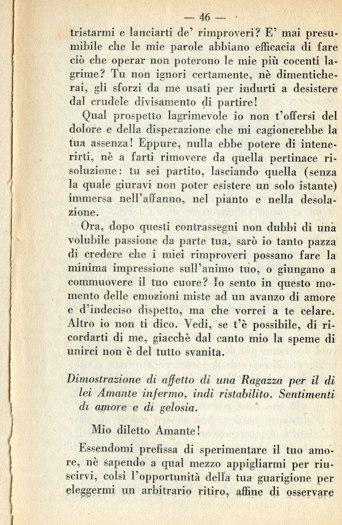 Ora, dopo questi contrassegni non dubbi di una volubile passione da parte tua, sarò io tanto pazza di credere che i miei rimproveri possano fare la minima impressione sull'animo tuo, o giungano a commuovere il tuo cuore? Io sento in questo momento delle emozioni miste ad un avanzo di amore e d'indeciso dispetto, ma che vorrei a te celare. Altro io non ti dico. Vedi, se t'è possibile, di ricordarti di me, giacché dal canto mio la speme di unirci non è del tutto svanita.