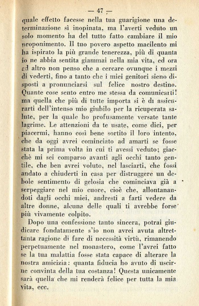 auale effetto facesse nella tua guarigione una determinazione sì inopinata, ma l'averti veduto un solo momento ha del tutto fatto cambiare il mio proponimento. Il tuo povero aspetto macilento mi ha ispirato la più grande tenerezza, più di quanta io ne abbia sentita giammai nella mia vita, ed ora ed altro non penso che a cercare ovunque i mezzi di vederti, fino a tanto che i miei genitori sieno disposti a pronunciarsi sul felice nostro destino. Quante cose sento entro me stessa da comunicaiti! ma quella che più di tutte importa si è di assicurarti dell'intenso mio giubilo per la ricuperata salute, per la quale ho profusamente versate tante lagrime. Le attenzioni da te usate, come dici, per piacermi, hanno così bene sortito il loro intento, che da oggi avrei cominciato ad amarti se fosse stata la prima volta in cui ti avessi veduto; giacché mi sei comparso avanti agli occhi tanto gentile, che ben avrei voluto, nel lasciarti, che fossi andato a chiuderti in casa per distruggere un debole sentimento di gelosia che cominciava già a ' serpeggiare nel mio cuore, cioè che, allontanandoti dagli occhi miei, andresti a farti vedere da altre donne, alcuna delle quali ti avrebbe forse più vivamente colpito.