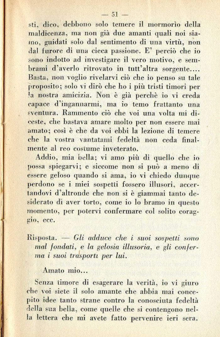 Senza timore di esagerare la verità, io vi giuro che voi siete il solo amante che abbia mai concepito idee tanto strane contro la conosciuta fedeltà della sua bella, come quelle che si contengono nella lettera che mi avete fatto pervenire ieri sera.