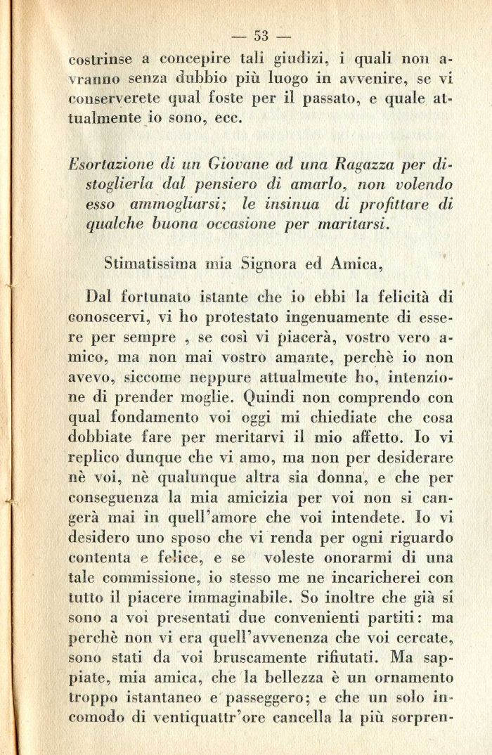 Dal fortunato istante che io ebbi la felicità di conoscervi, vi ho protestato ingenuamente di essere per sempre , se così vi piacerà, vostro vero a-mico, ma non mai vostro amante, perchè io non avevo, siccome neppure attualmente ho, intenzione di prender moglie. Quindi non comprendo con qual fondamento voi oggi mi chiediate che cosa dobbiate fare per meritarvi il mio affetto. Io vi replico dunque che vi amo, ma non per desiderare nè voi, nè qualunque altra sia donna, e che per conseguenza la mia amicizia per voi non si cangerà mai in quell'amore che voi intendete. Io vi desidero uno sposo che vi renda per ogni riguardo contenta e felice, e se voleste onorarmi di una tale commissione, io stesso me ne incaricherei con tutto il piacere immaginabile. So inoltre che già si sono a voi presentati due convenienti partiti : ma perchè non vi era quell'avvenenza che voi cercate, sono stati da voi bruscamente rifiutati. Ma sappiate, mia amica, che la bellezza è un ornamento troppo istantaneo e passeggero; e che un solo incomodo di ventiquattr'ore cancella la più sorpren-