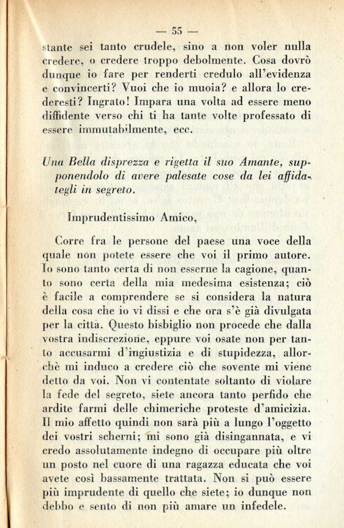 11 mio affetto quindi non sarà più a lungo l'oggetto dei vostri scherni; mi sono già disingannata, e vi credo assolutamente indegno di occupare più oltre un posto nel cuore di una ragazza educata che voi avete così bassamente trattata. Non si può essere più imprudente di quello che siete; io dunque non debbo e sento di non più amare un infedele.