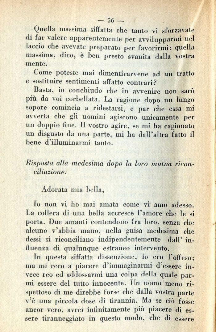 Io non vi ho mai amata come vi amo adesso. La collera di una bella accresce l'amore che le si porta. Due amanti contendono fra loro, senza che alcuno v'abbia mano, nella guisa medesima che dessi si riconciliano indipendentemente dall' influenza di qualunque estraneo intervento.