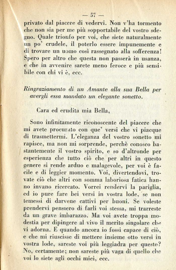 Sono infinitamente riconoscente del piacere che mi avete procurato con que' versi che vi piacque di trasmettermi. L'eleganza del vostro sonetto mi rapisce, ma non mi sorprende, perchè conosco bastantemente il vostro spirito, e so d'altronde per esperienza che tutto ciò che per altri in questo genere si rende arduo e malagevole, per voi è facile e di leggier momento. Voi, divertendovi, trovate ciò che altri con somma laboriosa fatica hanno invano ricercato. Vorrei rendervi la pariglia, ed io pure fare bei versi in vostra lode, se non temessi di darvene cattivi per buoni. Se voleste prendervi pensiero di farli voi stessa, mi trarreste da un grave imbarazzo. Ma voi avete troppa modestia per dipingere al vivo il merito singolare che vi adorna. E quando ancora io fossi capace di ciò, e che mi riuscisse di mettere insieme otto versi in vostra lode, sareste voi più leggiadra per questo? No, certamente; non sareste più vaga di quello che voi lo siete agli occhi miei, ecc.