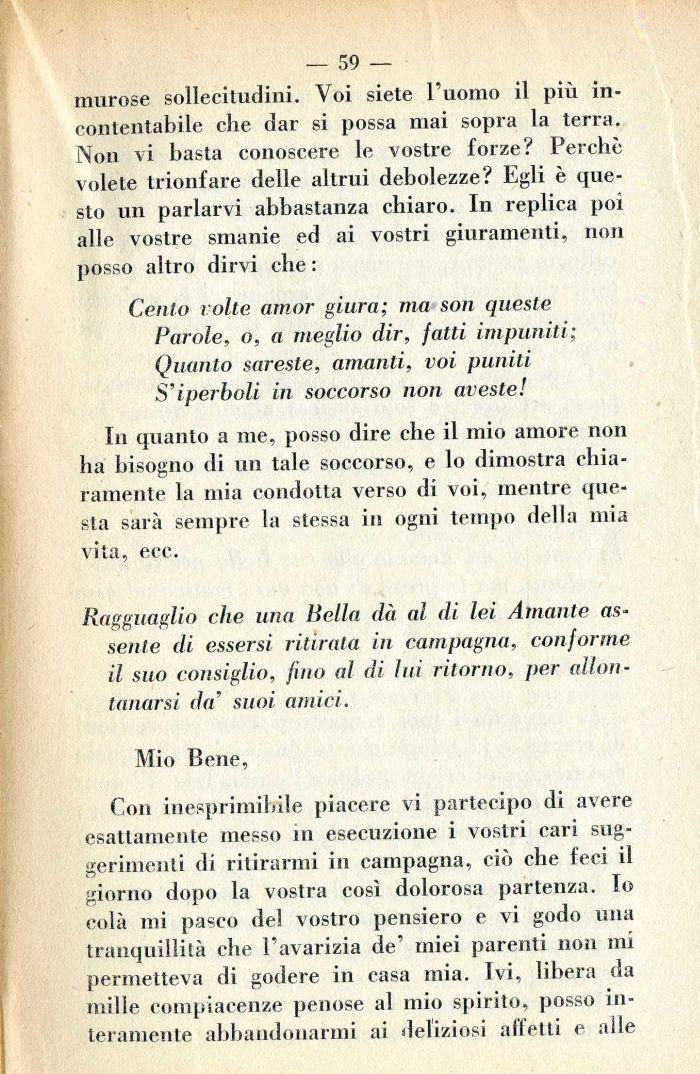 Con inesprimibile piacere vi partecipo di avere esattamente messo 111 esecuzione i vostri cari suggerimenti di ritirarmi in campagna, ciò che feci il giorno dopo la vostra così dolorosa partenza. Io colà mi pasco del vostro pensiero e vi godo una tranquillità che l'avarizia de' miei parenti non mi permetteva di godere in casa mia. Ivi, libera da mille compiacenze penose al mio spirito, posso interamente abbandonarmi ai deliziosi alleiti e aìle