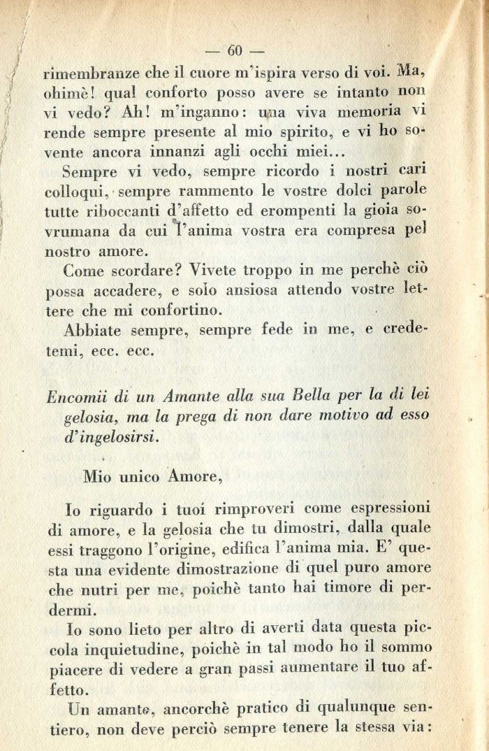 rimembranze che il cuore m'ispira verso di voi. Ma, ohimè! qua? conforto posso avere se intanto non vi vedo? Ali! m'inganno: una viva memoria vi rende sempre presente al mio spirito, e vi ho sovente ancora innanzi agli occhi miei...