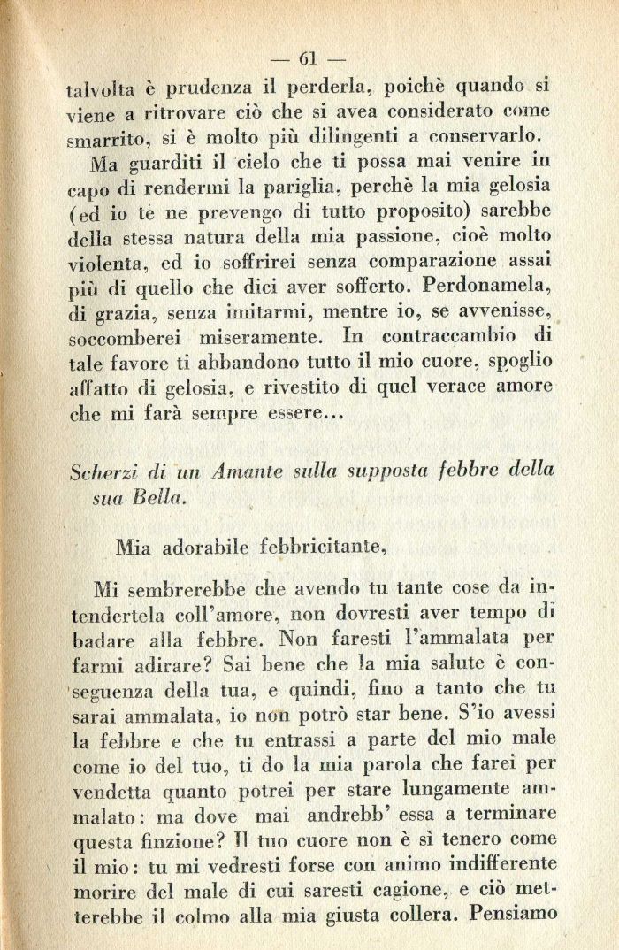 Ma guarditi il cielo che ti possa mai venire in capo di rendermi la pariglia, perchè la mia gelosia (ed io te ne prevengo di tutto proposito) sarebbe della stessa natura della mia passione, cioè molto violenta, ed io soffrirei senza comparazione assai più di quello che dici aver sofferto. Perdonamela, di grazia, senza imitarmi, mentre io, se avvenisse, soccomberei miseramente. In contraccambio di tale favore ti abbandono tutto il mio cuore, spoglio affatto di gelosia, e rivestito di quel verace amore che mi farà sempre essere...