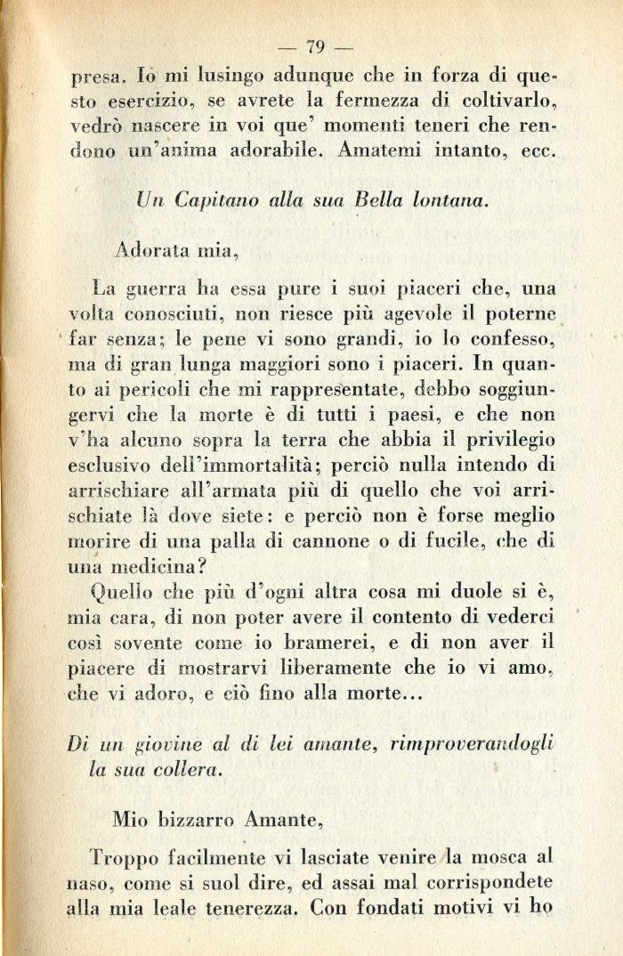 Quello che più d'ogni altra cosa mi duole si è, mia cara, di non poter avere il contento di vederci così sovente come io bramerei, e di non aver il piacere di mostrarvi liberamente che io vi amo, che vi adoro, e ciò fino alla morte...