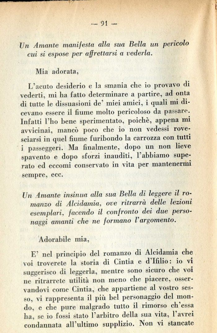 Un Amante insinua alla sua Bella di leggere il romanzo di Alcidamia, ove ritrarrà delle lezioni esemplari, facendo il confronto dei due personaggi amanti che ne formano l'argomento.