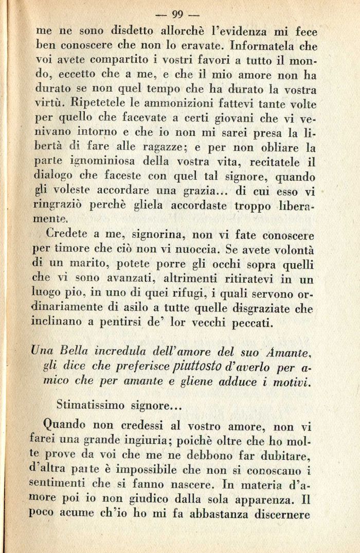 Una Bella incredula dell'amore del suo Amante, gli dice che preferisce piuttosto d'averlo per a• mico che per amante e gliene adduce i motivi.