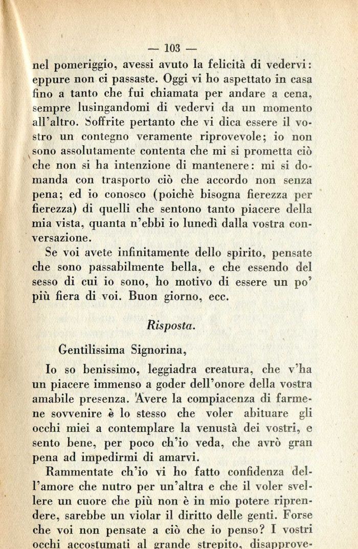 Io so benissimo, leggiadra creatura, che v'ha un piacere immenso a goder dell'onore della vostra amabile presenza. Avere la compiacenza di farmene sovvenire è lo stesso che voler abituare gli occhi miei a contemplare la venustà dei vostri, e sento bene, per poco ch'io veda, che avrò gran pena ad impedirmi di amarvi.