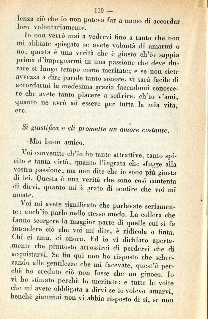 Io non verrò mai a vedervi fino a tanto che non mi abbiate spiegato se avete volontà di amarmi o 110; questa è una verità che è giusto ch'io sappia prima d'impegnarmi in una passione che deve durare si lungo tempo come meritate; e se non siete avvezza a dire parole tanto sonore, vi sarà facile di accordarmi la medesima grazia facendomi conoscere che avete tanto piacere a soffrire, ch'io v'ami, quanto ne avrò ad essere per tutta la mia vita, ecc.