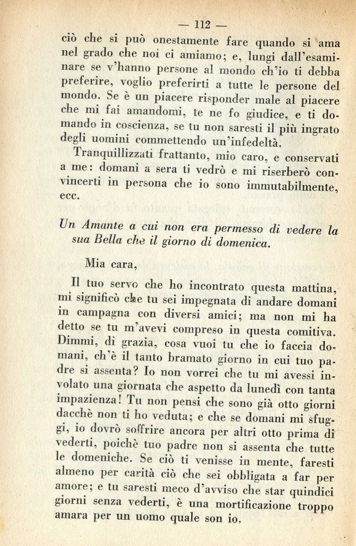 Il tuo servo che ho incontrato questa mattina, mi significò cke tu sei impegnata di andare domani in campagna con diversi amici; ma non mi ha detto se tu m'avevi compreso in questa comitiva. Dimmi, di grazia, cosa vuoi tu che io faccia domani, ch'è il tanto bramato giorno in cui tuo padre si assenta? Io non vorrei che tu mi avessi involato una giornata che aspetto da lunedì con tanta impazienza! Tu non pensi che sono già otto giorni dacché non ti ho veduta; e che se domani mi sfuggi, io dovrò soffrire ancora per altri otto prima di vederti, poiché tuo padre non si assenta che tutte le domeniche. Se ciò ti venisse in mente, faresti almeno per carità ciò che sei obbligata a far per amore; e tu saresti meco d'avviso che star quindici giorni senza vederti, è una mortificazione troppo amara per un uomo quale son io»