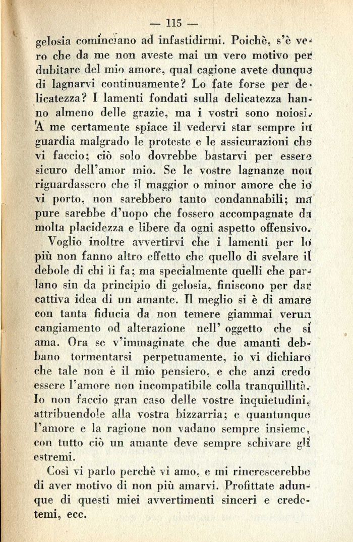 gelosia cominciano ad infastidirmi. Poiché, s'è vero che da me non aveste mai un vero motivo per dubitare del mio amore, qual cagione avete dunque di lagnarvi continuamente? Lo fate forse per delicatezza? I lamenti fondati sulla delicatezza hanno almeno delle grazie, ma i vostri sono noiosi.' À me certamente spiace il vedervi star sempre ili guardia malgrado le proteste e le assicurazioni chs vi faccio; ciò solo dovrebbe bastarvi per essero sicuro dell'amor mio. Se le vostre lagnanze noii riguardassero che il maggior o minor amore che io' vi porto, non sarebbero tanto condannabili; ma' pure sarebbe d'uopo che fossero accompagnate di molta placidezza e libere da ogni aspetto offensivo.