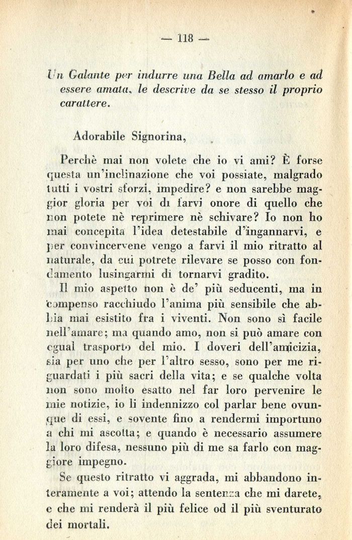 Perchè mai non volete che io vi ami? È forse questa un'inclinazione che voi possiate, malgrado tutti i vostri sforzi, impedire? e non sarebbe maggior gloria per voi di larvi onore di quello che non potete nè reprimere nè schivare? Io non ho mai concepita l'idea detestabile d'ingannarvi, e per convincervene vengo a farvi il mio ritratto al naturale, da cui potrete rilevare se posso con fondamento lusingarmi di tornarvi gradito.